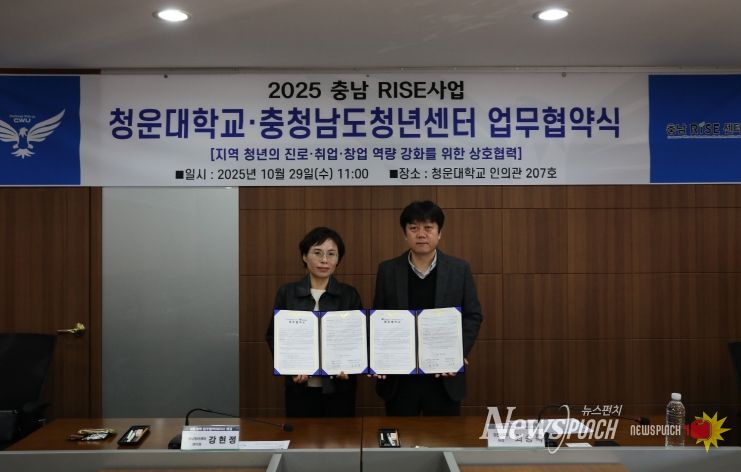 뉴스펀치 강영선 기자 | 충청남도청년센터는 29일 청운대와 지역 청년의 역량을 강화하고 지역사회 내 청년의 사회 참여 확대와 지역 정착 촉진을 도모하기 위한 업무협약(MOU)을 체결했다고 밝혔다.
