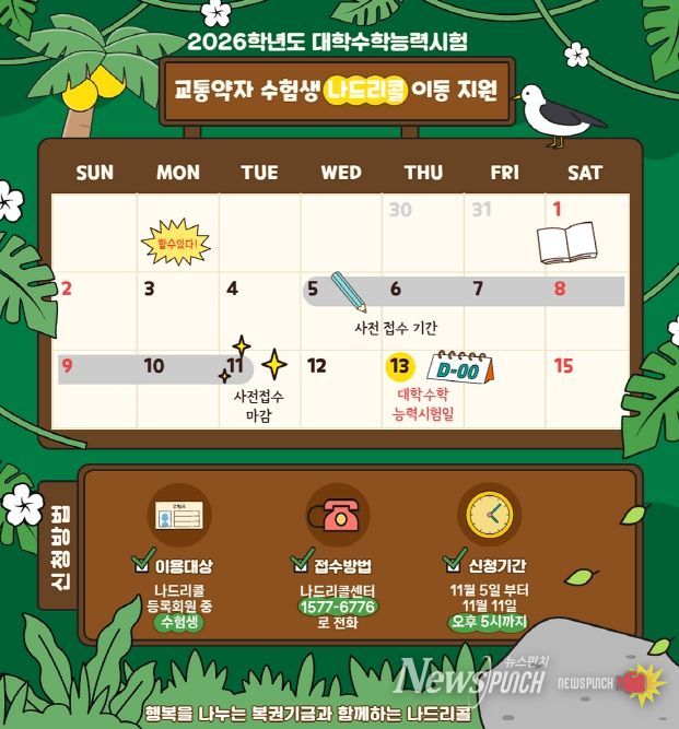 뉴스펀치 조평훈 기자 | 대구공공시설관리공단이 운영하는 교통약자 특별교통수단 나드리콜이 11월 13일 2026학년도 수능을 치르는 교통약자 수험생을 위해 무료 운행을 실시한다.