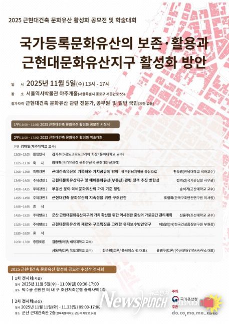 뉴스펀치 김희경 기자 | 국가유산청은 11월 5일 오전 10시부터 서울역사박물관(서울 종로구)에서 ‘2025 근현대건축 문화유산 활성화 공모전’의 우수 작품에 대한 시상식을 개최하고, 같은 날 오후 1시에는 ‘국가등록문화유산의 보존·활용과 근현대문화유산지구 활성화 방안’을 주제로 학술대회를 진행한다.