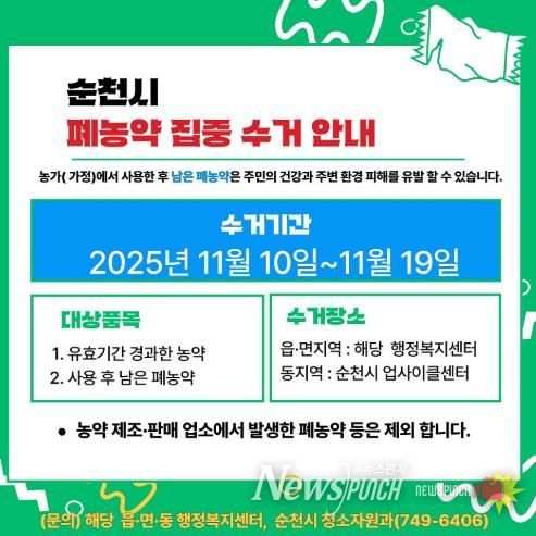 뉴스펀치 조평훈 기자 | 순천시는 농가와 가정에서 사용 후 남은 폐농약과 유효기간이 지난 농약을 안전하게 수거하기 위해 폐농약 집중수거 기간을 운영한다고 밝혔다.