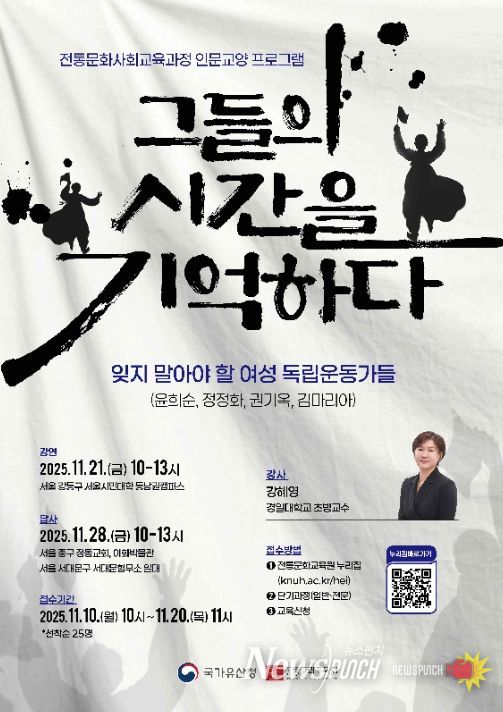 뉴스펀치 김희경 기자 | 국가유산청 한국전통문화대학교 전통문화교육원은 11월 21일과 28일, 2회에 걸쳐 2025년도 인문교양프로그램 '그들의 시간을 기억하다 - 잊지 말아야 할 여성 독립운동가들'을 운영한다.