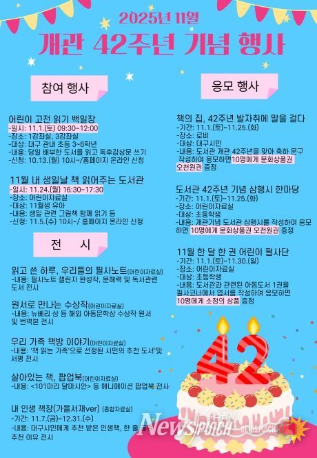 뉴스펀치 조평훈 기자 | 대구북부도서관은 개관 42주년을 맞이하여 11월 한 달간 대구 시민 누구나 참여할 수 있는 10개의 기념 특별 행사를 운영한다.