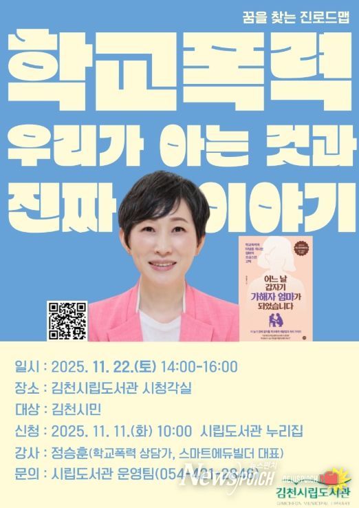 뉴스펀치 김길룡 기자 | 김천시립도서관에서는 오는 11월 22일 오후 2시, 시립도서관 본관 시청각실에서 김천시민을 대상으로 ‘학교폭력, 우리가 아는 것과 진짜 이야기’를 주제로 강연을 개최한다고 밝혔다.