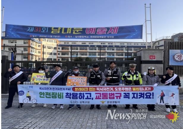 뉴스펀치 김완규 기자 | 서울 성북구는 11월 5일 남대문중학교 정문 앞에서 ‘픽시자전거 및 전기자전거·PM 안전이용 캠페인’을 실시했다고 밝혔다.
