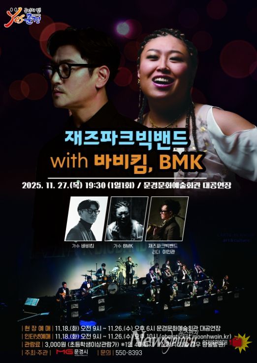 뉴스펀치 김길룡 기자 | 문화예술회관에서는 11월 기획공연으로 재즈파크빅밴드 with 바비킴, BMK 공연을 11월 27일(목) 19:30 (1일1회)에 문경문화예술회관 대공연장에서 개최한다.