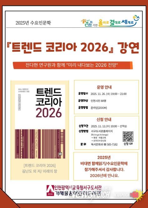 뉴스펀치 김길룡 기자 | 인천광역시교육청서구도서관은 11월 26일 오후 7시부터 9시까지 『트렌드 코리아 2026』의 공동 저자 전다현 연구원을 초청해 ‘미리 내다보는 2026 전망’ 강연을 진행한다.