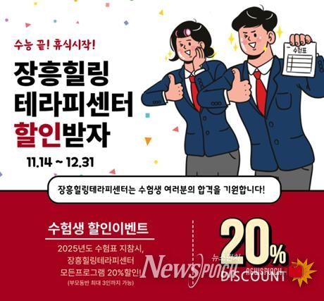 이번 프로모션은 2025년 수능 수험표를 지참한 수험생 본인 및 동반한 부모님을 대상으로 하며, 힐링테라피센터의 모든 프로그램을 20% 할인된 가격에 이용할 수 있다.