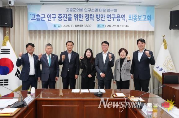 뉴스펀치 김길룡 기자 | 고흥군의회 의원연구단체인 ‘고흥군의회 인구소멸 대응 연구회’는 지난 11월 10일 군의회 소회의실에서 ‘고흥군 인구 증진을 위한 정착 방안 연구용역’ 최종보고회를 개최하고 올해 연구활동을 성공적으로 마무리했다고 밝혔다.