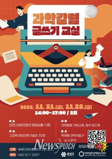 뉴스펀치 이현승 기자 | 대전 유성구는 오는 21일과 28일 대전스타트업파크센터에서 고경력 은퇴 과학기술인 대상 ‘과학 칼럼 글쓰기 교실’을 운영한다.