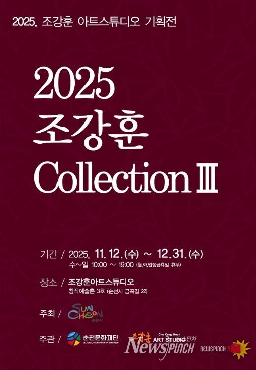 뉴스펀치 김길룡 기자 | 순천문화재단은 오는 11월 12일부터 12월 31일까지 창작예술촌 3호 조강훈 아트 스튜디오에서 ‘2025 조강훈 컬렉션Ⅲ’ 전시를 개최한다.