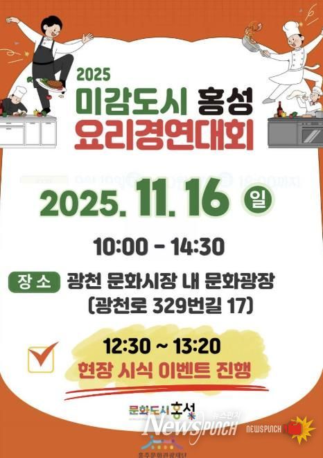 뉴스펀치 김길룡 기자 | 홍성군은 오는 16일 광천 문화시장 내 문화광장에서 ‘2025년 미감도시 홍성 요리경연대회’를 개최한다고 밝혔다.