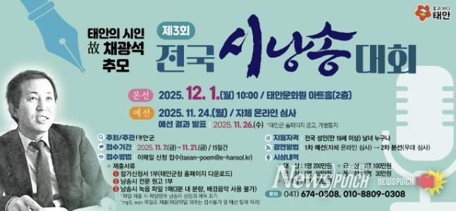 12월 1일 진행되는 본선은 예선 심사 결과에 따라 최대 50명이 참가할 것으로 예상되며, 오전 10시부터 태안문화원 아트홀에서 현장 낭독 방식으로 진행된다.