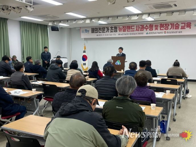 뉴스펀치 김길룡 기자 | 함양군은 경남농업기술원과 함께 지난 12일, 농업기술센터에서 ‘해외전문가 초청 뉴질랜드 사과수형 및 현장기술 교육’을 진행했다.