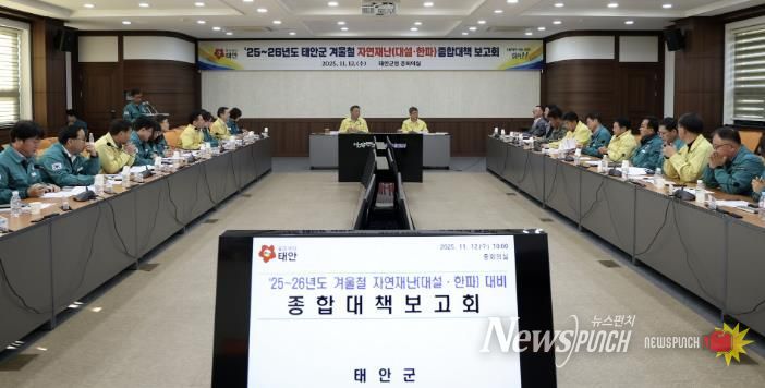 군은 지난 12일 군청 중회의실에서 부군수와 실국장, 관련 부서장, 읍면장, 기상청·유관기관 관계자 등 33명이 참석한 가운데 가세로 군수 주재로 ‘25~26년도 태안군 겨울철 자연재난(대설·한파) 종합대책 보고회’를 열고 대응계획을 점검했다고 밝혔다.