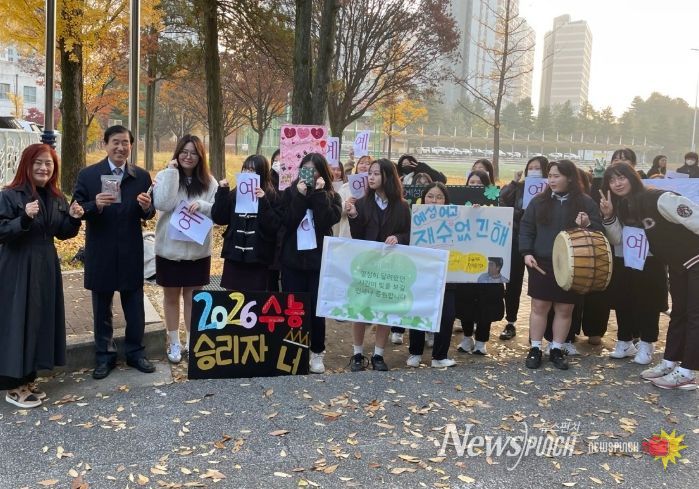 뉴스펀치 김길룡 기자 | 2026학년도 대학수학능력시험이 13일 오전 8시 40분부터 전국적으로 일제히 치러지는 가운데, 충주시에서도 수험생들의 합격을 기원하는 응원의 열기가 뜨겁다.
