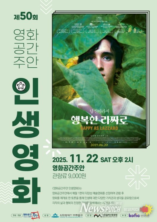 뉴스펀치 김길룡 기자 | 인천 미추홀구가 운영하는 예술영화관 영화공간주안(관장 박영우)은 오는 22일 오후 2시, ‘제50회 인생 영화’로 이탈리아의 걸작 ‘행복한 라짜로’를 상영한다.
