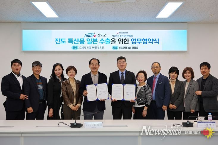 뉴스펀치 김길룡 기자 | 진도군은 지난 16일 재일본큐슈한국인연합회(회장 심현수)와 ‘진도청정 농수산물 수출협약식’을 열고 일본 시장에 진출하기 위한 협력 관계를 공식화했다.