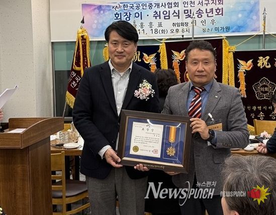 뉴스펀치 김길룡 기자 | 인천광역시 서구는 지난 18일 공인중개사협회 제13·14대 회장 이취임식과 함께 유공 공인중개사 표창식을 진행했다.