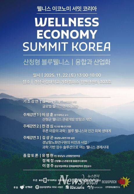뉴스펀치 김길룡 기자 | 경상국립대학교 RISE 사업단(지역연계·산청군 과제)과 경기대학교 관광종합연구소는 산청군의 웰니스 관광 발전을 위한 업무협약(MOU)을 체결하고, 그 후속 성과를 공유하고 실행 과제를 구체화할 ‘웰니스 이코노미 서밋 코리아(Wellness Economy Summit Korea)’를 11월 22일 오후 1시 가좌캠퍼스 GNU컨벤션센터 303호에서 연다.