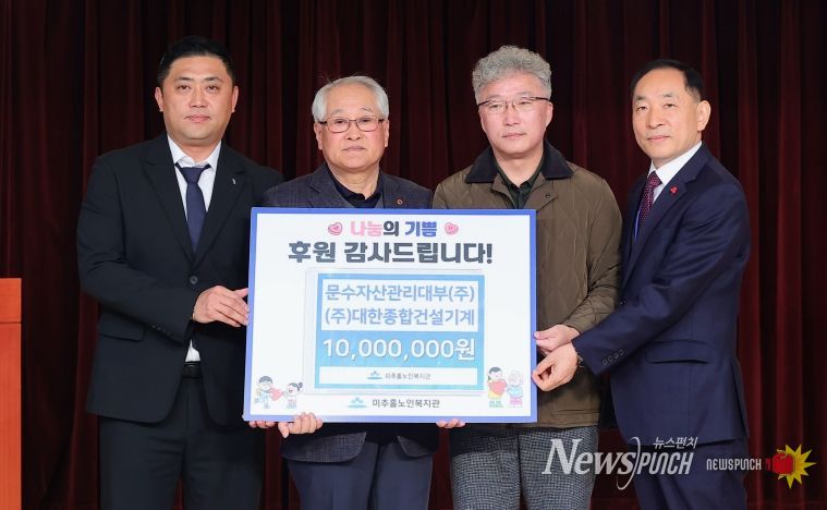 뉴스펀치 김길룡 기자 | 인천 미추홀노인복지관(관장 김호일, 이하 복지관)은 19일 ㈜대한종합건설기계(대표 정광조)와 ㈜문수자산관리대부(대표 김일두)로부터 각각 500만 원씩, 총 1,000만 원의 후원금을 전달받았다.