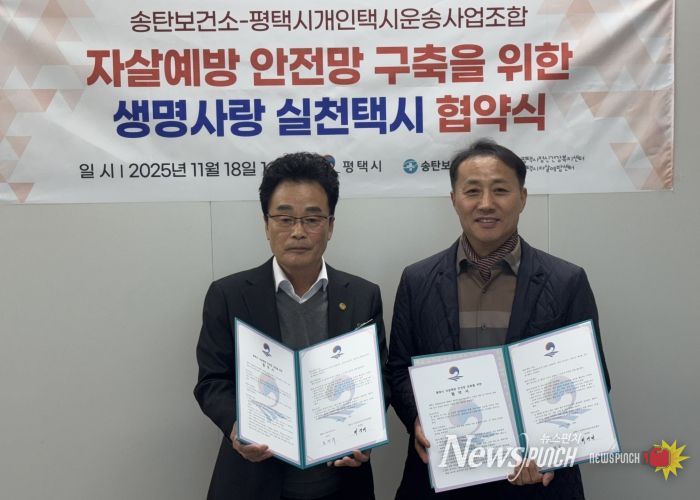 뉴스펀치 김길룡 기자 | 평택시 송탄보건소는 생명 존중 문화 확산 및 자살 예방을 위한 민관 협력 강화의 하나로, 평택시개인택시운송사업조합과 ‘생명사랑 실천택시’ 협약을 지난 18일 체결했다고 밝혔다.