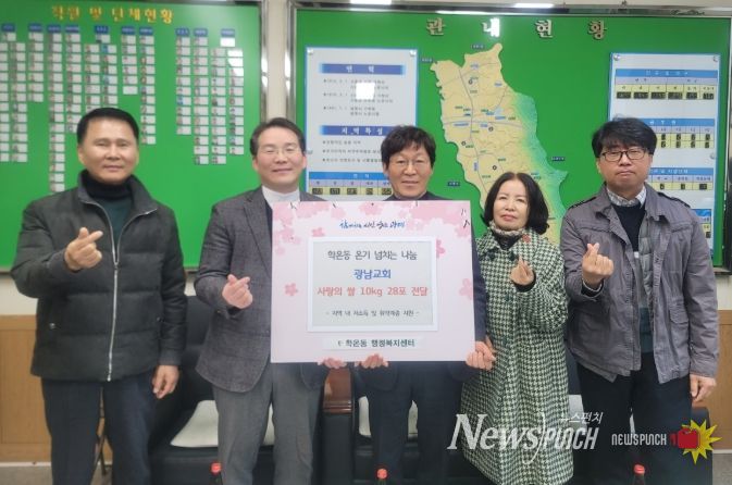 뉴스펀치 김길룡 기자 | 광명시 학온동 행정복지센터는 지난 18일 추수감사절을 맞아 학온동 광남교회로부터 교인들이 정성껏 모은 쌀 10kg들이 28포를 전달받았다.