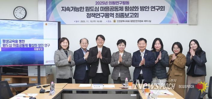 뉴스펀치 김길룡 기자 | 인천광역시의회 의원연구단체 ‘지속가능한 원도심 마을공동체 활성화 방안 연구회’가 19일 행정안전위원회 세미나실에서 정책연구용역 최종 보고회를 열고, 평생교육을 기반으로 한 인천형 원도심 공동체 활성화 모델을 발표했다.