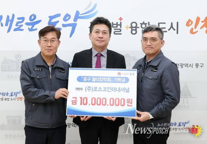 뉴스펀치 김길룡 기자 | 인천 중구 월디장학회는 ㈜포스코인터내셔널(누적 기탁금 : 1억 3,000만 원)로부터 1,000만 원의 장학금을 기탁받았다고 20일 밝혔다.