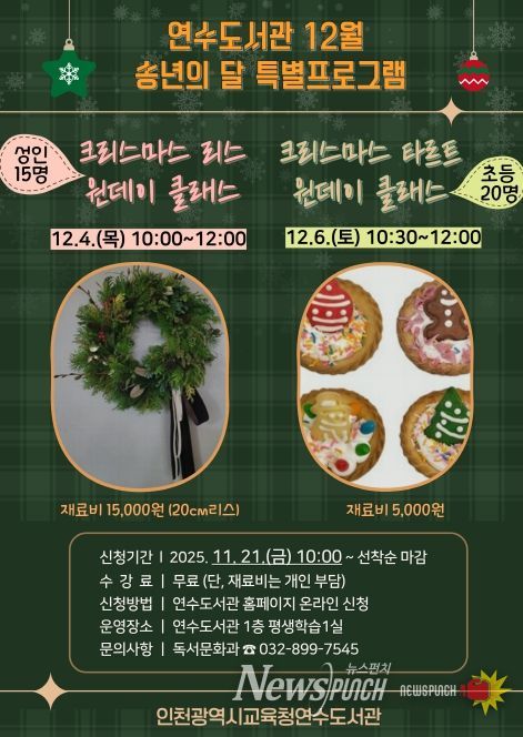 뉴스펀치 김길룡 기자 | 인천광역시교육청연수도서관은 12월 4일부터 6일까지 지역 주민을 위한 ‘12월 송년의 달 특별프로그램’을 운영한다.