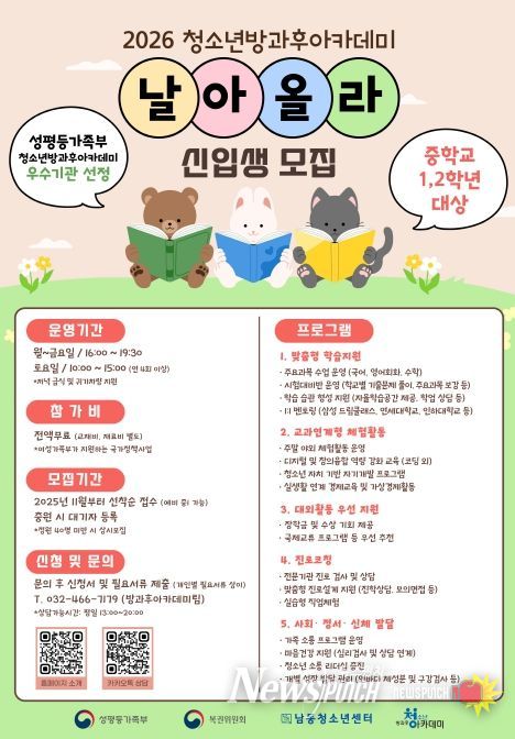 뉴스펀치 김길룡 기자 | 인천시 남동구 남동청소년센터는 청소년방과후아카데미 ‘날아올라’가 11월부터 2026년도 신입생을 선착순 모집한다고 20일 밝혔다.