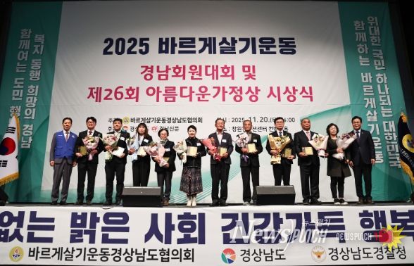 뉴스펀치 김길룡 기자 | 경상남도가 20일 창원컨벤션센터에서 열린 ‘2025 바르게살기운동 경남 회원대회 및 제26회 아름다운 가정상 시상식’에서 지역사회 봉사에 앞장서 온 회원들을 격려했다.