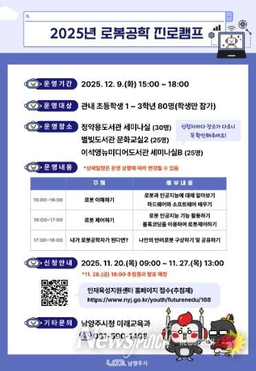 뉴스펀치 김길룡 기자 | 남양주시는 20일부터 27일까지 관내 초등학교 1학년부터 3학년을 대상으로 ‘2025년 로봇공학 진로캠프’참가자를 모집한다.