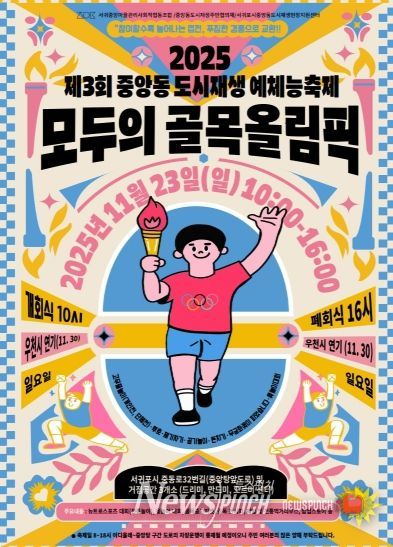 뉴스펀치 김길룡 기자 | 서귀포시는 서귀포시 중앙동 도시재생사업의 일환으로 〈2025 제3회 중앙동 도시재생 예체능축제 - 모두의 골목 올림픽〉을 11월 23일 10:00 ~ 16:00 중앙동 골목 및 거점시설에서 개최한다.