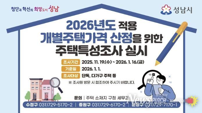 뉴스펀치 김길룡 기자 | 성남시는 내년 1월 16일까지 단독·다가구·상가주택을 대상으로 ‘2026년 1월 1일 기준 개별주택가격 산정’을 위한 주택특성조사를 실시한다.