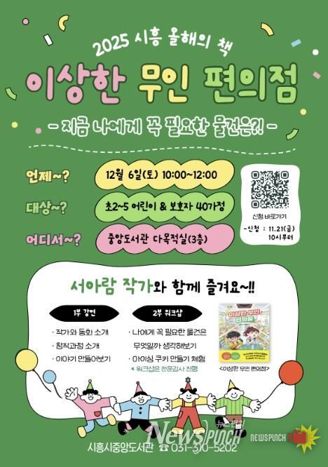 뉴스펀치 김길룡 기자 | 시흥시중앙도서관은 ‘2025 시흥 올해의 책’ 어린이 분야 선정 도서인 '이상한 무인 편의점'의 서아람 작가 초청 강연을 오는 12월 6일 오전 10시부터 중앙도서관 다목적실에서 운영한다.