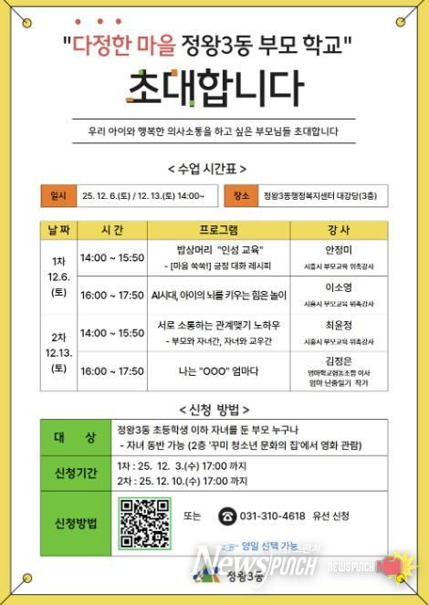 뉴스펀치 김길룡 기자 | 시흥시 정왕3동 행정복지센터는 오는 12월 6일과 13일 양일간, 자녀와의 올바른 의사소통 방법을 배우고 부모 역할에 대한 자신감을 높일 수 있는 ‘다정한 마을 정왕3동 부모학교’를 운영한다.