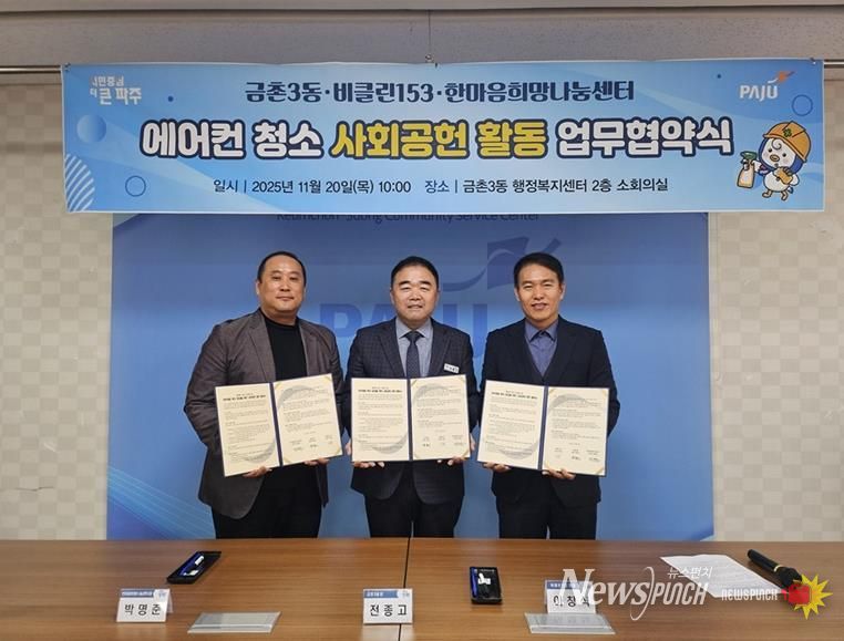 뉴스펀치 김길룡 기자 | 파주시 금촌3동은 지난 20일 ‘비클린153’, ‘한마음희망나눔센터’와 함께 관내 취약계층의 주거환경 개선을 위한 ‘생활가전 클리닝 사회공헌 활동 업무협약’을 체결했다고 밝혔다.