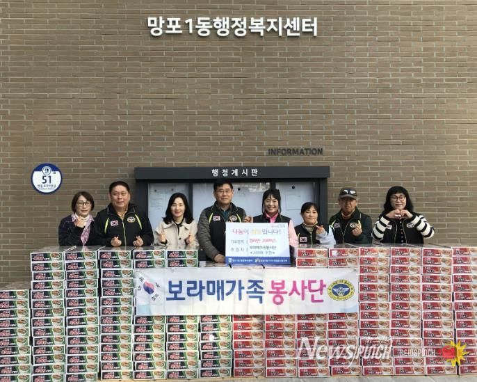 공군전우회 봉사 모임인 보라매가족봉사단은 망포1동의 어려운 이웃을 위해 꾸준히 후원을 해오고 있으며, 특히 이번 후원은 매월 나눔활동을 하고 있는 보라매가족봉사단의 100회째 나눔활동이며, 봉사단체가 결성된지 100개월이 되어 더욱 뜻깊은 후원이 됐다.