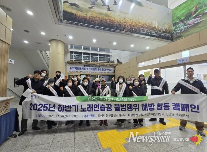 뉴스펀치 김길룡 기자 | 화성특례시가 지난 20일 병점중심상가 일원에서 노래연습장 불법행위 예방을 위한 2025년 하반기 합동 캠페인을 실시했다.