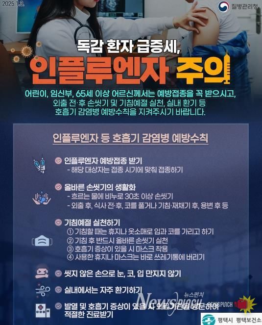 뉴스펀치 김길룡 기자 | 평택시는 이번 觝-觞절기 인플루엔자 유행이 예년보다 이르게 시작됨에 따라, 감염병 확산 방지를 위해 예방접종 참여 및 마스크 착용 등 기본적인 예방수칙 준수를 시민들에게 당부했다.