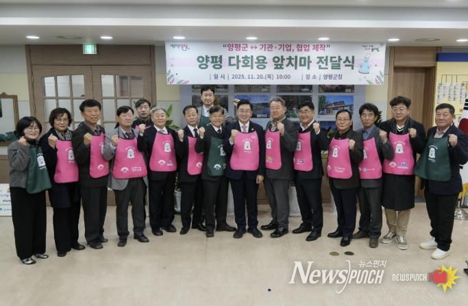 뉴스펀치 김길룡 기자 | 양평군은 지난 20일 양평군청에서 기관·기업 대표 12명과 군 관계자 등이 참석한 가운데 ‘양평 다회용 앞치마 협업 제작 전달식’과 ‘1회용품 사용 줄이기 서약식’을 개최했다.