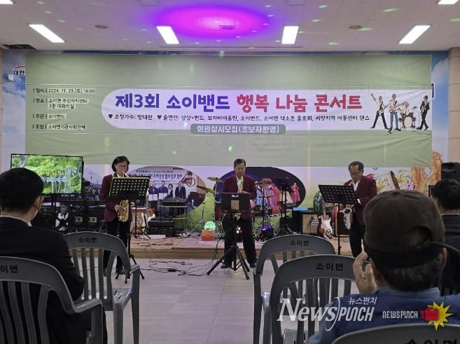 뉴스펀치 김길룡 기자 | 소이면 대표 음악 동아리인 소이밴드가 이달 29일 오후 4시 소이면 주민자치센터 대회의실에서 ‘제4회 소이밴드 행복 나눔 콘서트’를 개최한다고 밝혔다.