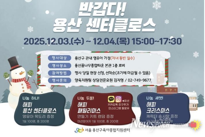 뉴스펀치 김완규 기자 | 서울 용산구가 위탁 운영하는 용산구육아종합지원센터는 다가오는 성탄절을 맞아 영유아 가정을 위해 내달 3~4일 오후 3시~5시 30분 용산꿈나무종합타운(백범로 329) 1층에서 ‘반갑다! 용산센터클로스’를 개최한다.