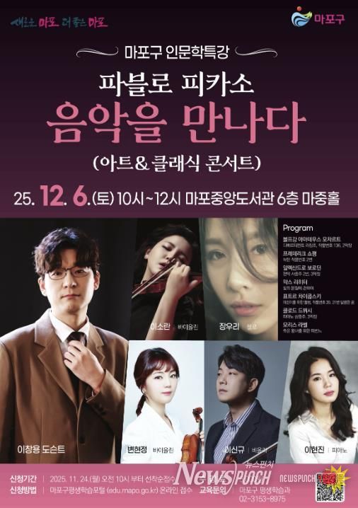 뉴스펀치 김완규 기자 | 마포구는 오는 12월 6일 오전 10시부터 12시까지 마포중앙도서관 6층 마중홀에서 연말 인문학특강 ‘파블로 피카소, 음악을 만나다(아트&클래식 콘서트)’를 개최한다.