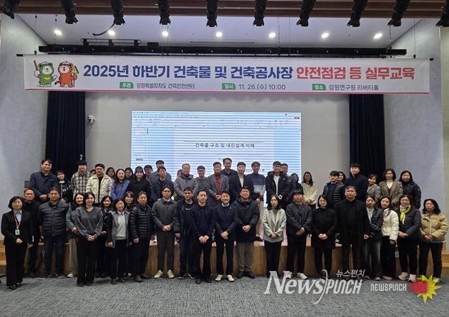 뉴스펀치 김길룡 기자 | 강원특별자치도는 최근 전국적으로 건축현장에서 중대재해 사고가 잇따라 발생함에 따라 건축분야 안전점검 실무자의 전문성과 현장 대응능력 강화를 위해 11월 26일 강원연구원 리버티홀에서 '건축물 및 건축공사장 등 안전점검 실무교육'을 실시했다고 밝혔다.