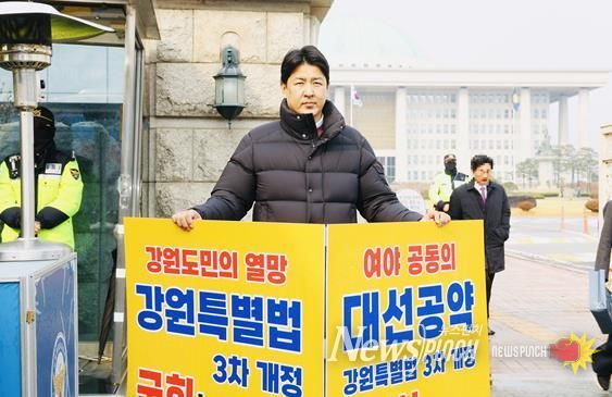 뉴스펀치 김길룡 기자 | 강원특별자치도의회 문관현 기획행정위원장은 27일 여의도 국회 앞에서 ‘강원특별법 3차 개정안’의 조속한 처리를 촉구하며 릴레이 1인 시위에 나섰다.