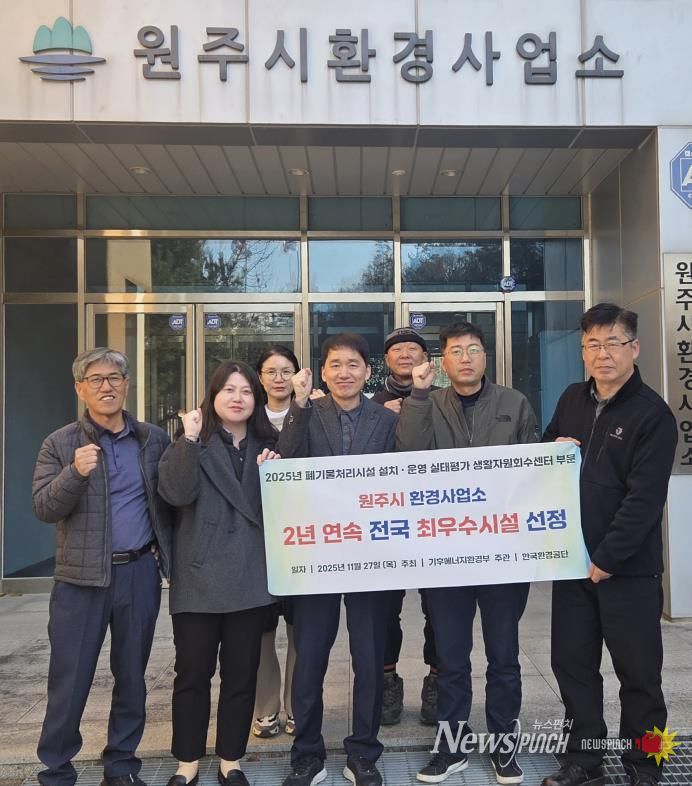 뉴스펀치 김길룡 기자 | 원주시환경사업소는 지난 27일 기후에너지환경부가 주최하고 한국환경공단이 주관한 ‘2025년 폐기물처리시설 운영실태평가’에서 생활자원회수센터 부문 ‘2년 연속 최우수 기관’으로 선정돼, 장관 표창 및 포상금 300만 원을 받았다.