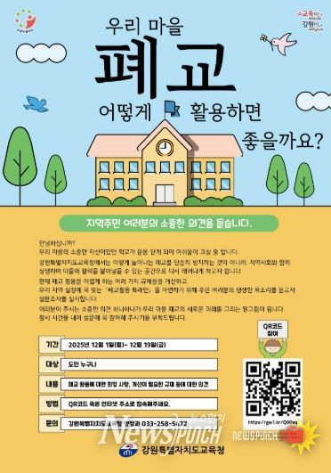 뉴스펀치 김길룡 기자 | 강원특별자치도교육청은 오는 12월 1일부터 12월 19일까지 폐교 재산의 효율적 활용을 위한 ‘폐교활용 특례안 마련 설문조사’를 실시한다고 밝혔다.