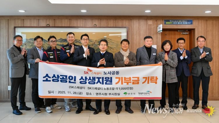 뉴스펀치 김길룡 기자 | 영주시는 지난 28일 시청 부시장실에서 SK스페셜티 노사가 지역사회 상생을 위해 총 2천만 원을 기부하는 ‘소상공인 상생지원 기부금 전달식’을 개최했다.