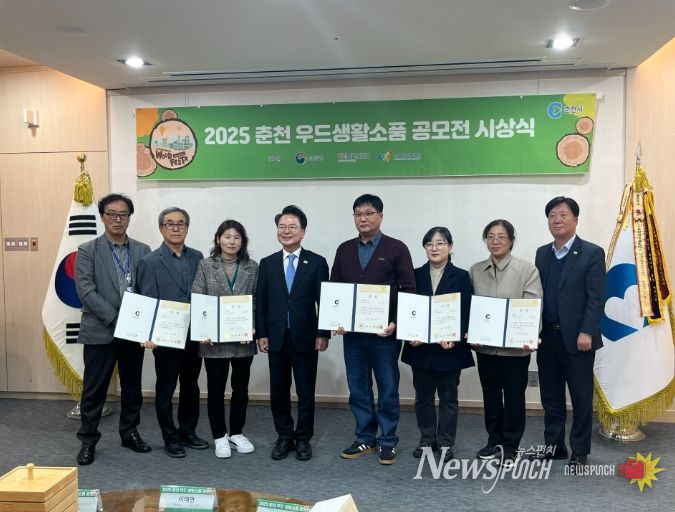 뉴스펀치 김길룡 기자 | 춘천시가 28일 시청 접견실에서 ‘2025 춘천우드페스타 우드생활소품 공모전’ 시상식을 열고 우수 작품 5점을 선정해 시상했다.